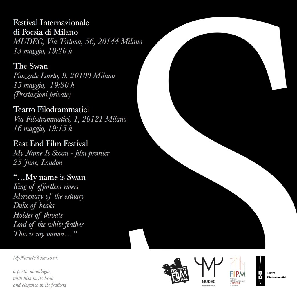 - Jan Noble will be performing his poetic monologue “My Name Is Swan” at three venues in Milan. Saturday, 13 May at 19:20h at the Festival Internazionale di Poesia di Milano, MUDEC, Via Tortona, 56, 20144 Milano. On Monday 15th May at 19:30h he will give a private reading at The Swan, Piazzale Loreto, 9, 20100 Milano. On Tuesday night, 16 May at 19:15h he will perform at the spectacular Teatro Filodrammatici , Via Filodrammatici, 1, 20121 Milano.