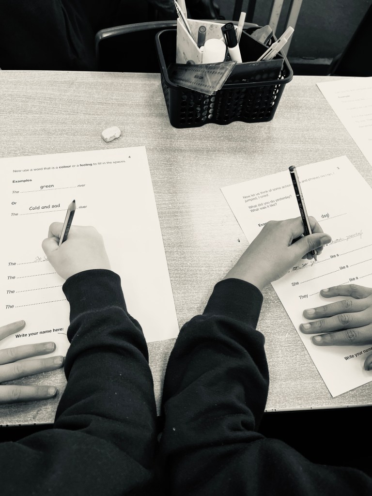 Using worksheets I encouraged the children to create ‘similes’, single lines comparing one thing to another: “The sun was like…” etc and then suggested they share a few lines about how they felt and why.