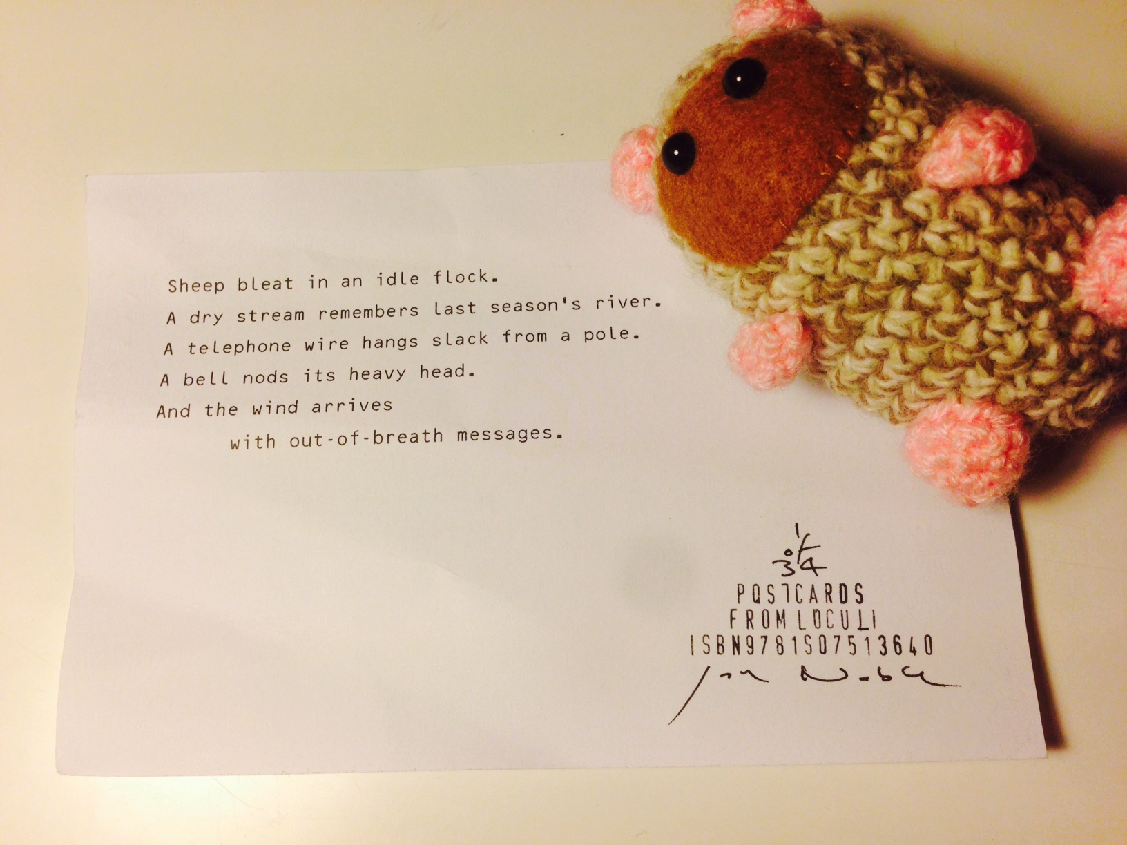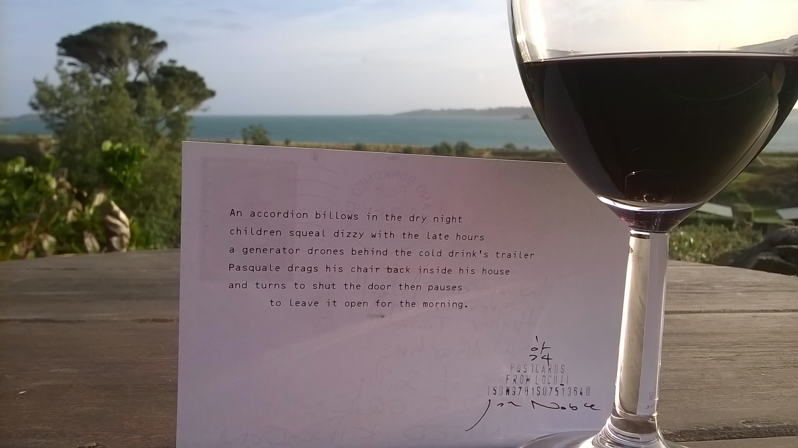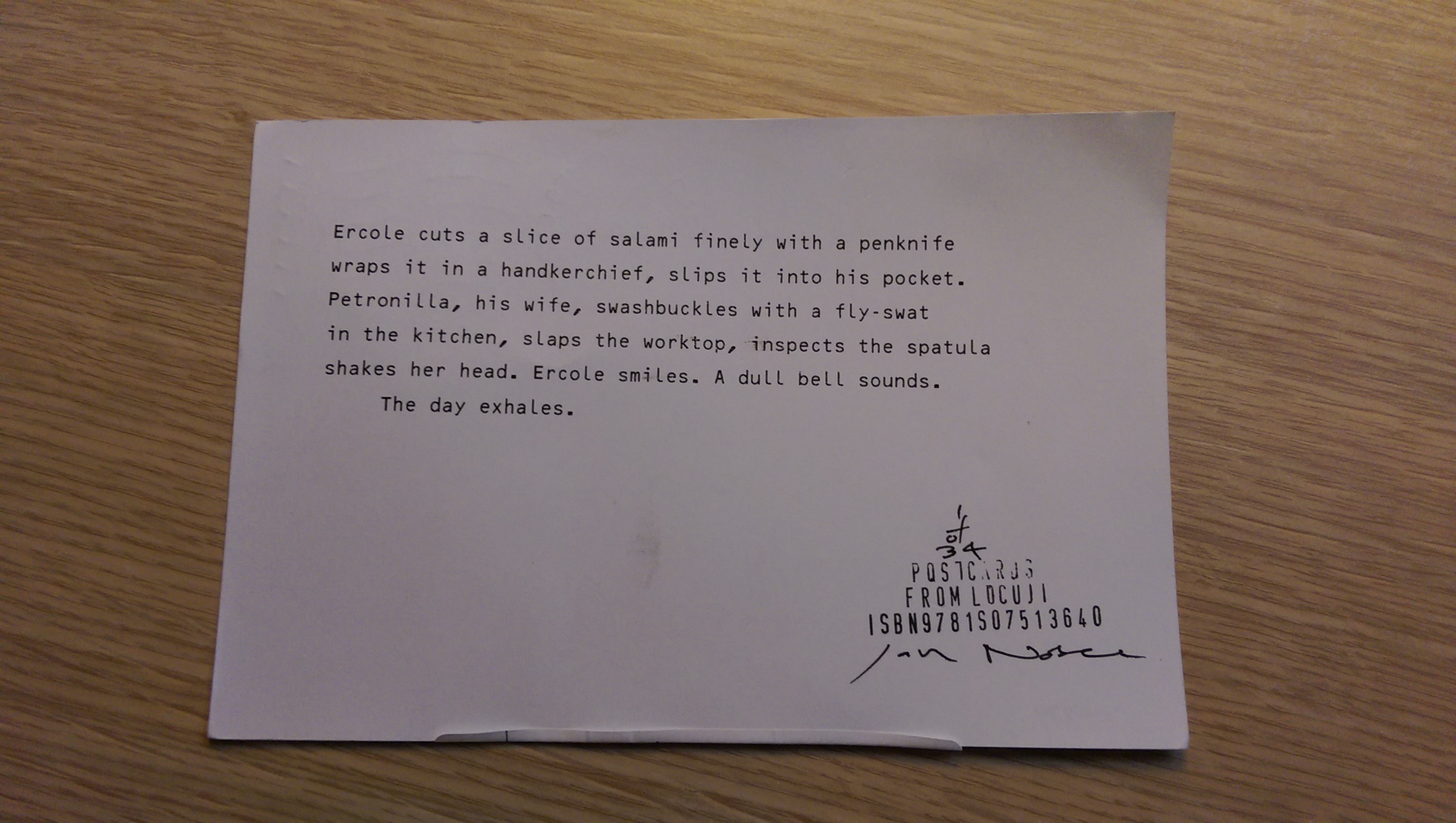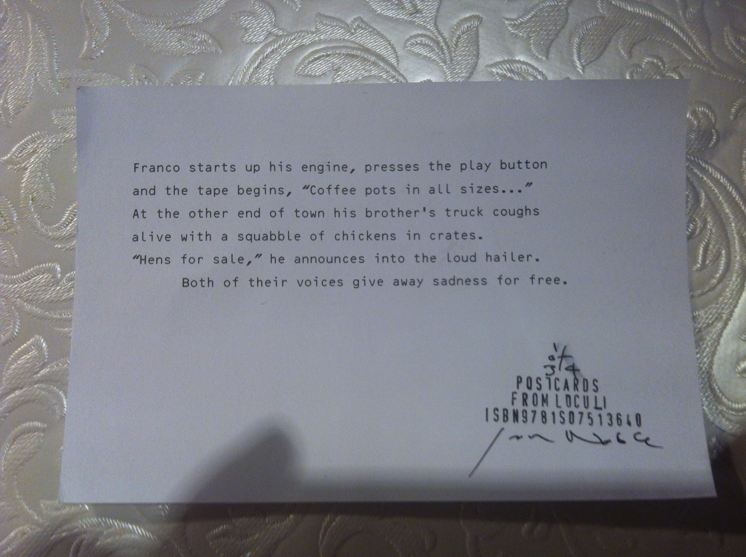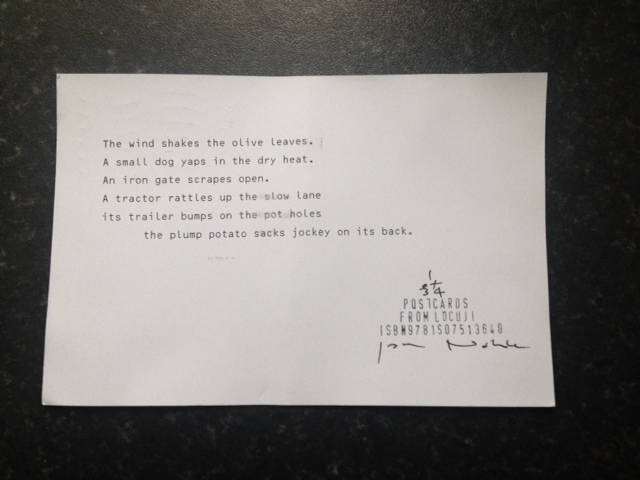 In September 2014 I sent 34 postcards from the village of Loculi in Sardinia. Each postcard contained a single stanza from a long poem. The poem itself contained 34 stanzas. The whole poem is owned collectively by its 34 recipients. It is spread across four continents, published in fragments in other people’s letterboxes.