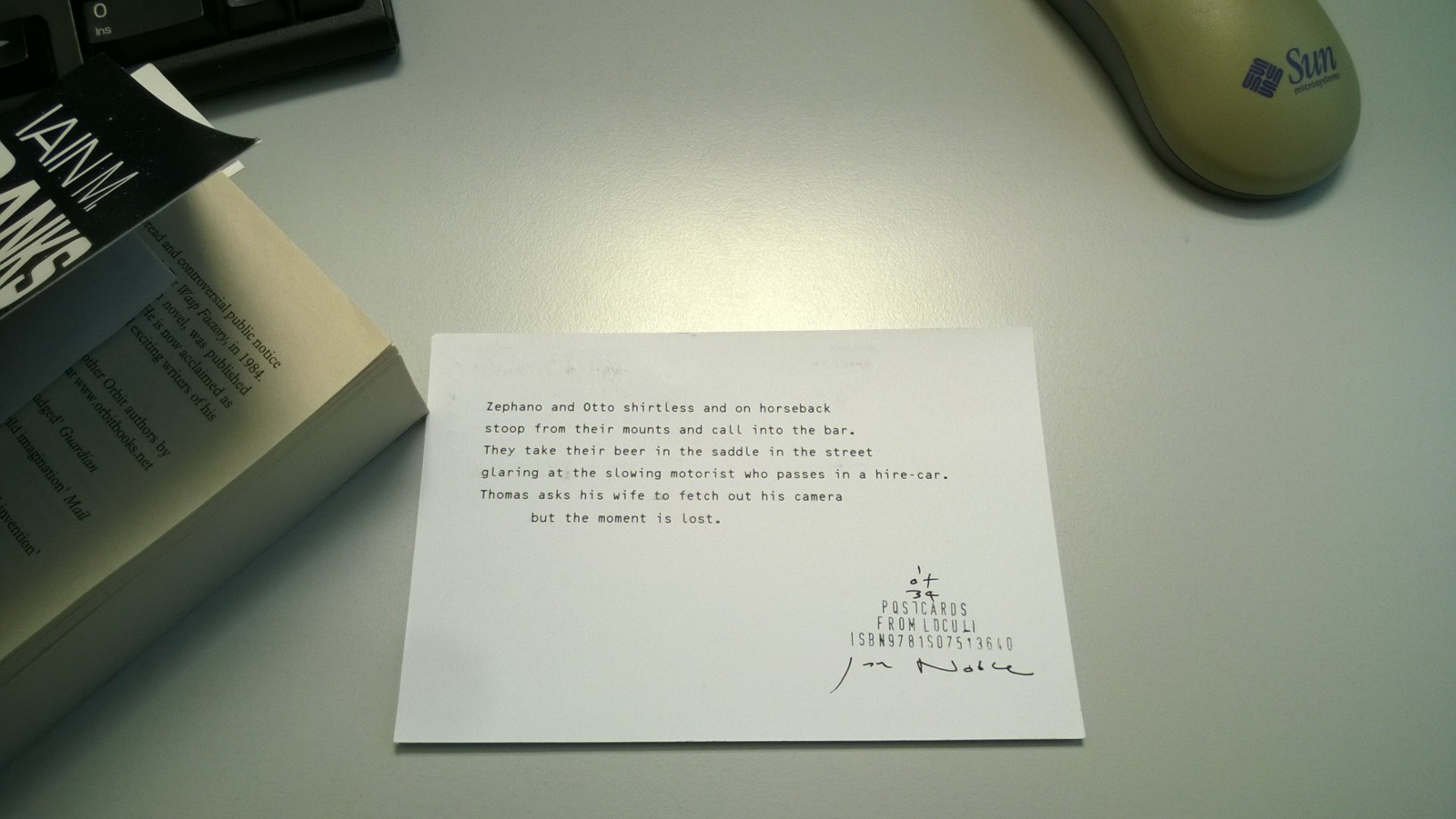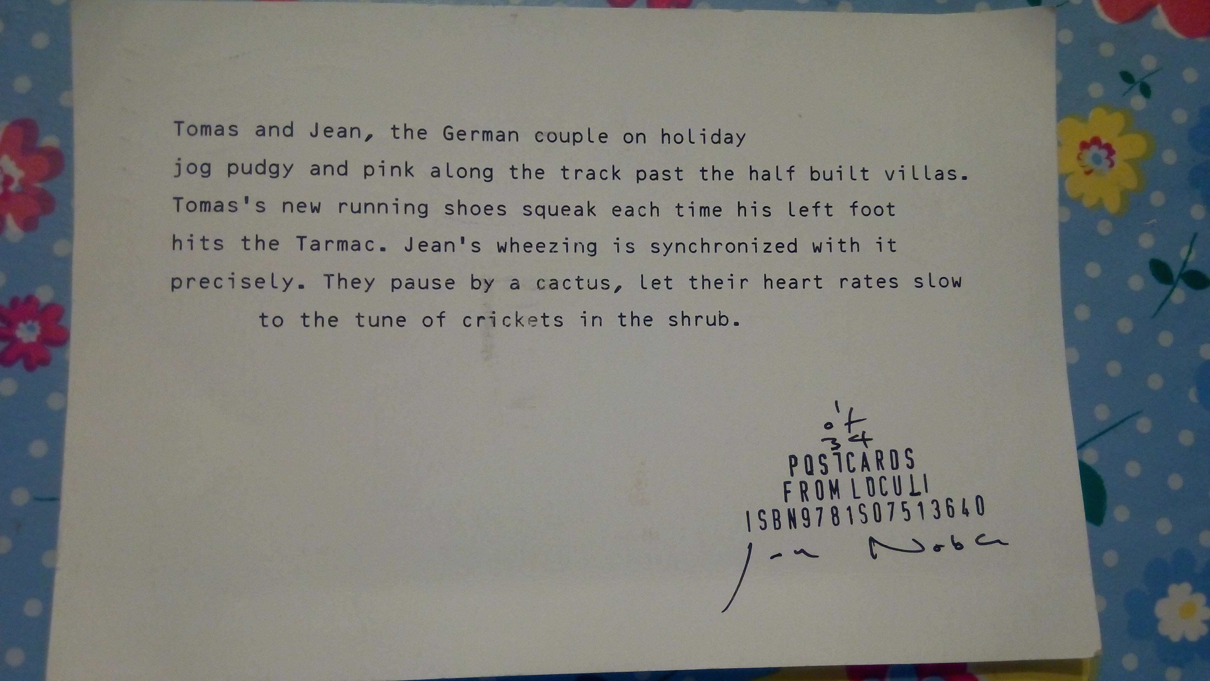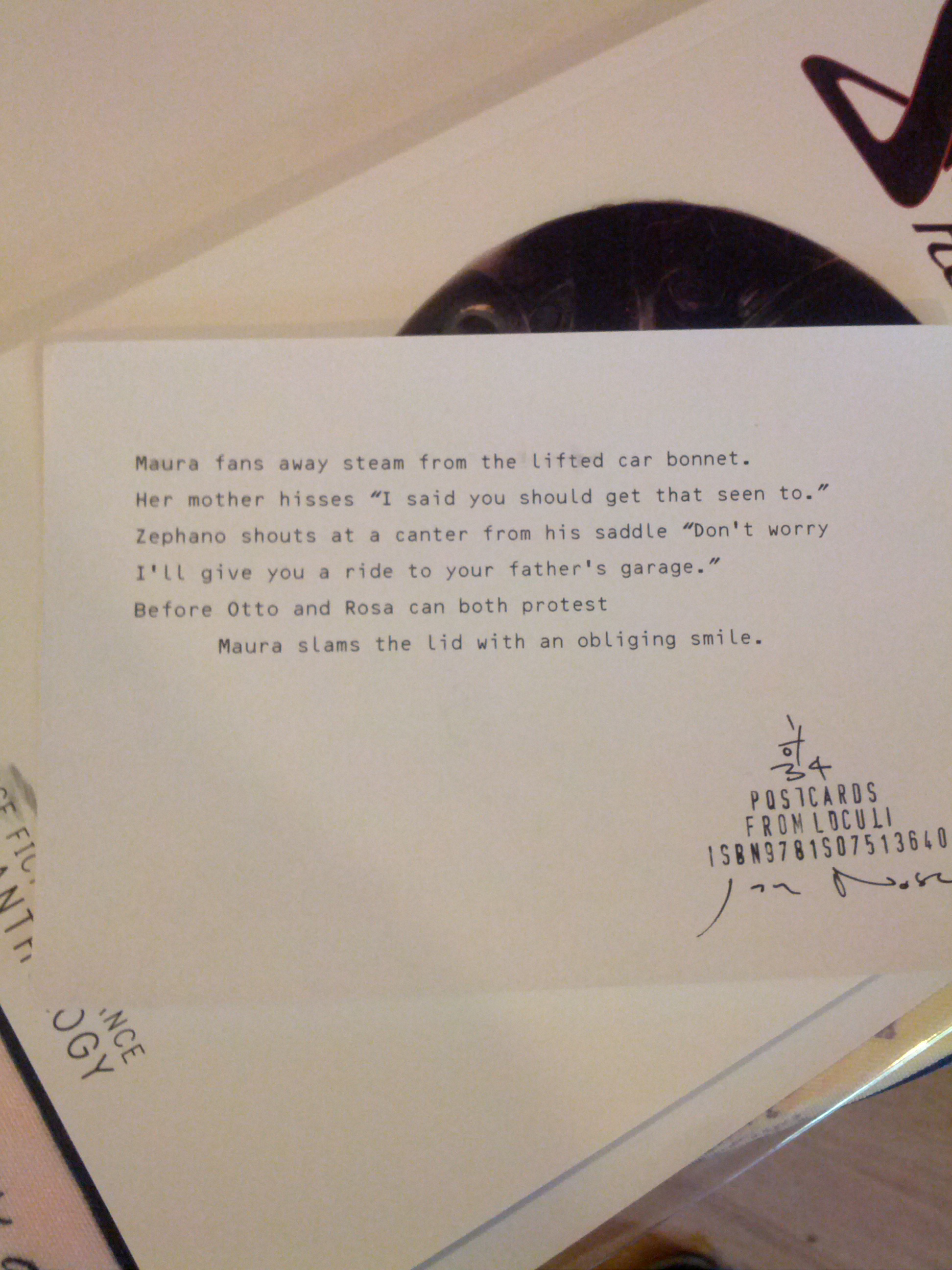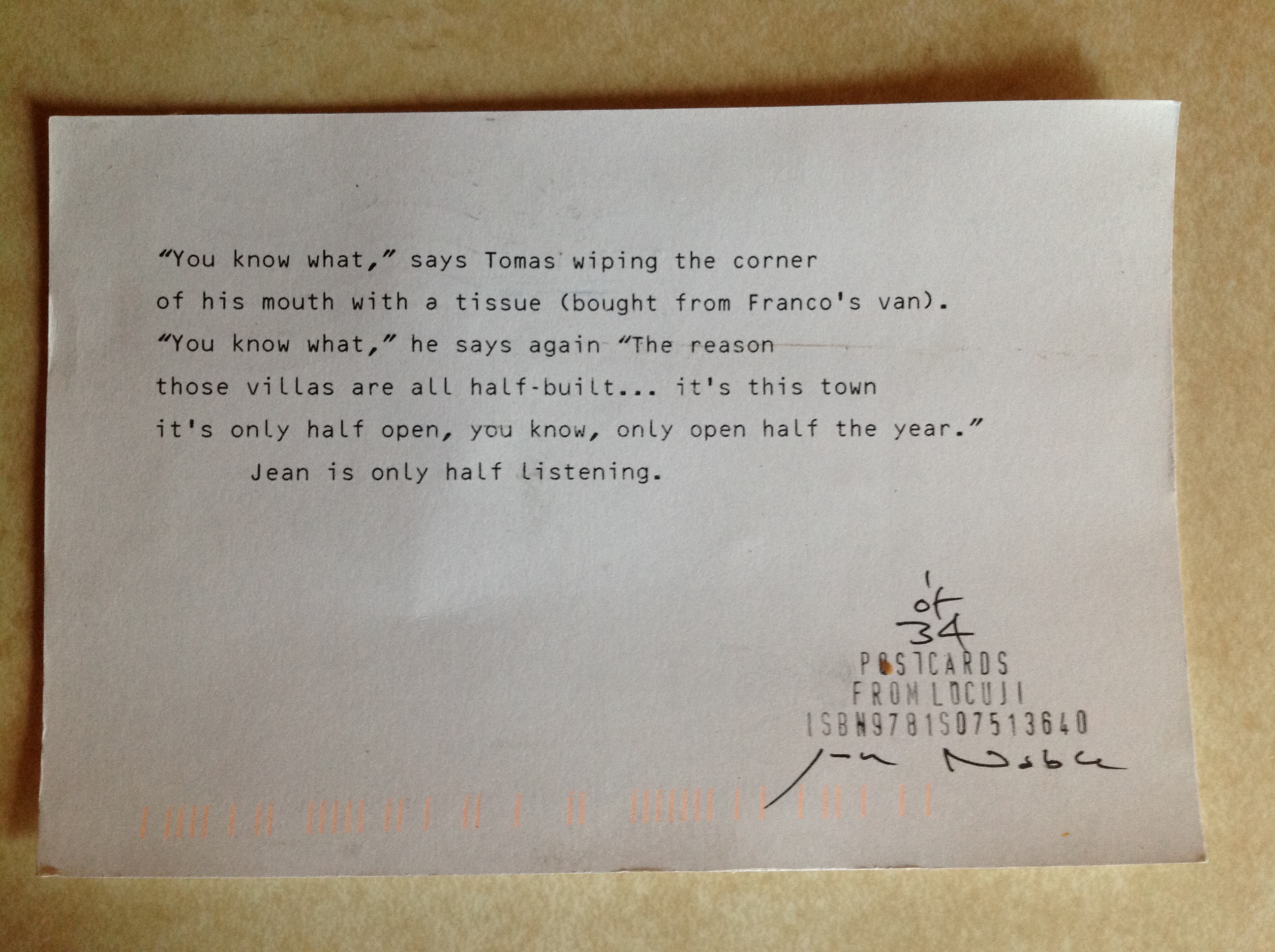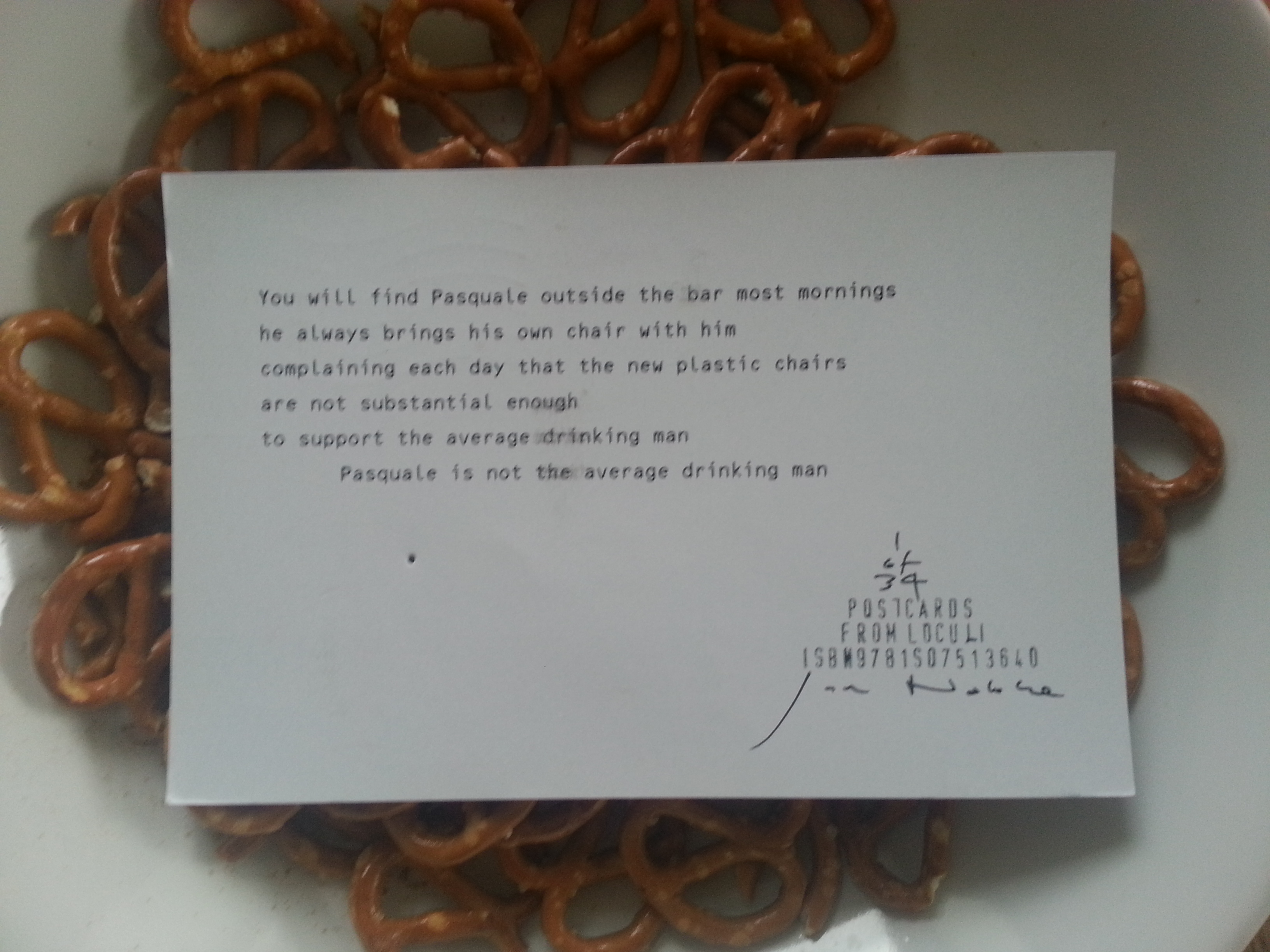In September 2014 I sent 34 postcards from the village of Loculi in Sardinia. Each postcard contained a single stanza from a long poem. The poem itself contained 34 stanzas. The whole poem is owned collectively by its 34 recipients. It is spread across four continents, published in fragments in other people’s letterboxes.