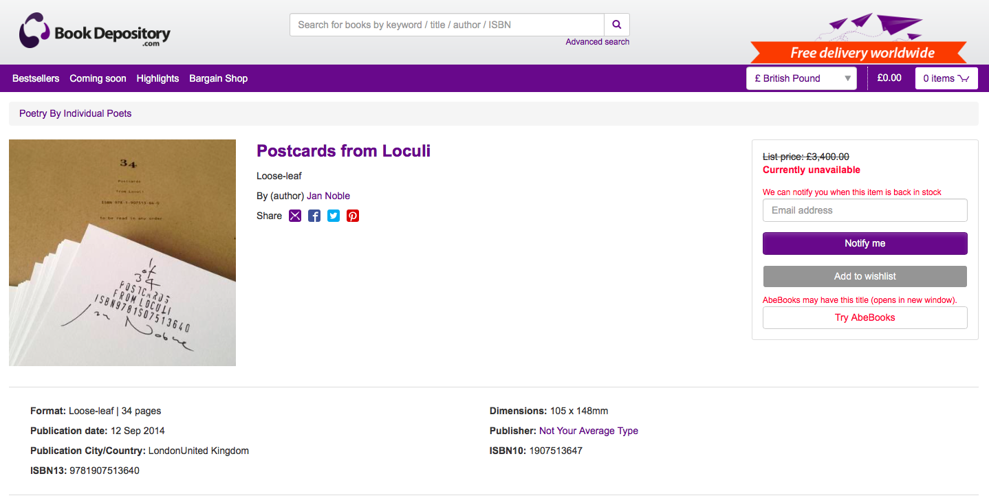 One copy of this thirty-four-page loose-leaf poem has been made available for sale as a book. Its publication status is ‘currently unavailable’. It will require an editor to collect and collate all thirty-four postcards from their individual recipients for the book to become ‘active’. All profits from the sale can be collected by the editor. The suggested RRP is £3400.